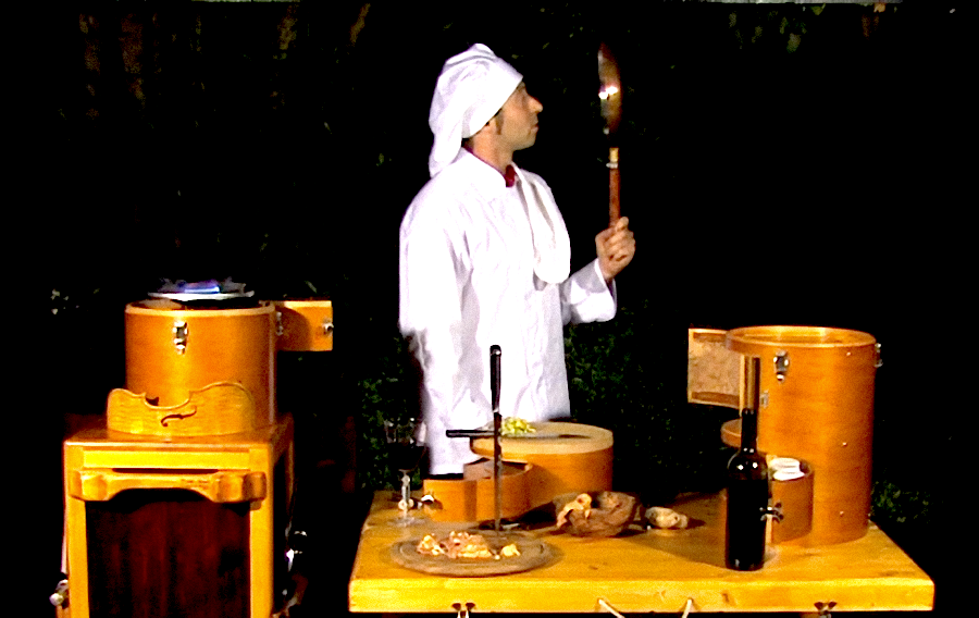 Lo spettacolo, ambientato all’interno di un’originale scultura cucina, fonde in un’unica sfera sensoriale percezioni di sensi distinti, mirando giocosamente al ventre. Mentre il cuoco/attore narra le straordinarie storie scritte da Giuliano Scabia in In capo al mondo, sfrigolii, cottura, sibilo del fuoco e tagli divengono la colonna sonora che accompagna tutte le sue azioni. La musica del cucinare e del linguaggio diventa strumento per giocare, tutto unito e scandito dal ritmo.