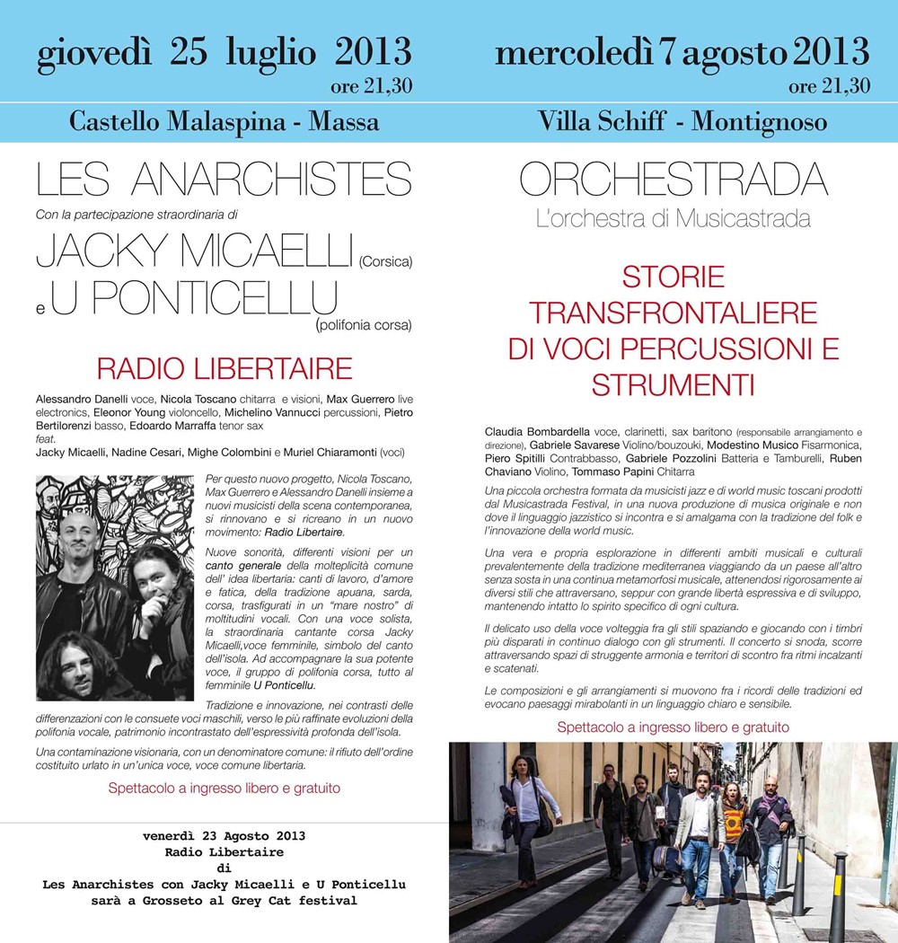 L’Orchestrada prevede una piccola orchestra formata da musicisti jazz e di world music toscani prodotti dal Musicastrada Festival, in una nuova produzione anche di musica originale dove il linguaggio jazzistico si incontra e si amalgama con la tradizione del folk e l’innovazione della world music.