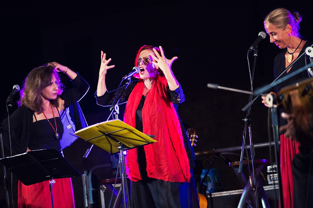 Gli artisti che salgono silenziosamente e informalmente sul palco, su cui si staglia il rosso delle lunghe gonne e degli scialli delle tre cantanti. Poi la musica, dal vivo, per un'ora e mezza quasi ininterrotta. Primo brano della performance non poteva essere che "Bella ciao", che titola la serata e ne riassume la valenza storica e artistica, reiterpretato dalle voci di Lucilla Galeazzi, Elena Ledda e Ginevra di Marco, Andrea Salvatori, Alessio Lega (voce e chitarra) e Gigi Biolcati (voce e percussioni).